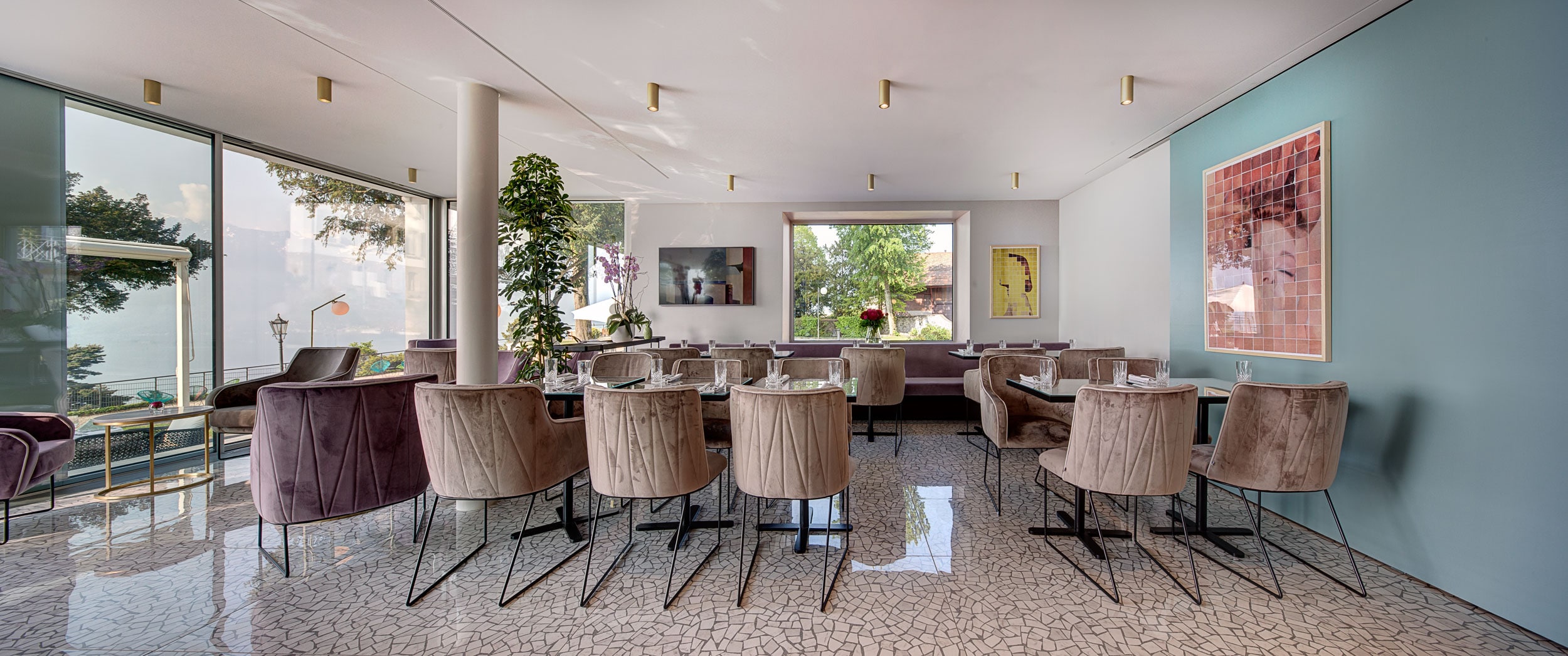 Die Erneuerung und Ausstattung des Empfangs, der Bar und der Bau eines Decks, der L’Epicurienne nach aussen vergrössert, wurden dem Unternehmen Linea Lombardo SA aus Montreux übertragen, in Zusammenarbeit mit Nathalie Mika-Huys, der Geschäftsführerin des Zentrums. « Wie auch für die Renovierung des Restaurants 2017, stand am Anfang meiner Überlegungen der 60er Jahre-Stil, der in verschiedenen Architekturmerkmalen des Gebäudes zu finden ist » erklärt Christophe Lombardo, der Architekt. Die grossen Fensterscheiben und die mit Fliesen bedeckten Tische geben dem Bar den Eindruck einer Veranda, und eine unschlagbare Öffnung nach Aussen. Das Naturlicht, dass die Bar durchflutet, reflektiert sich auf dem polierten weissem Marmor-Boden von « Terrazzo ».